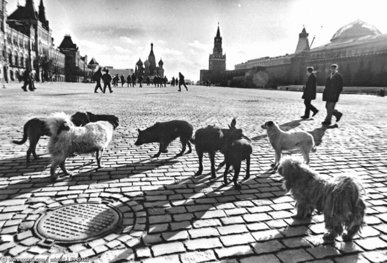 Бездомные собаки на Красной площади в Москве, 1993 год. Фото: Геннадий Михеев